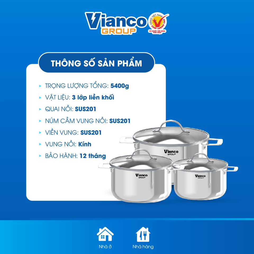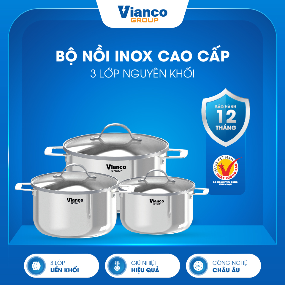 Bộ Nồi Inox cao cấp Vianco 3 Món Dày Dặn Liền Nguyên Khối