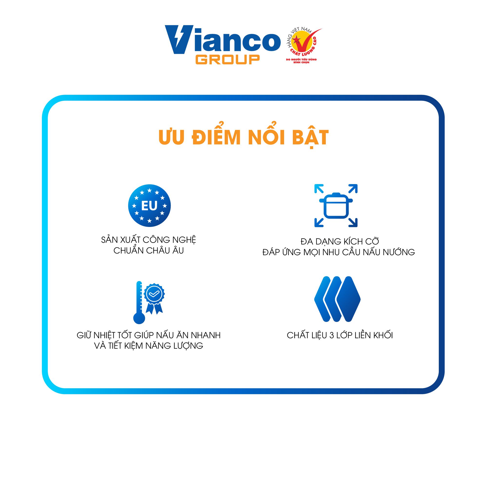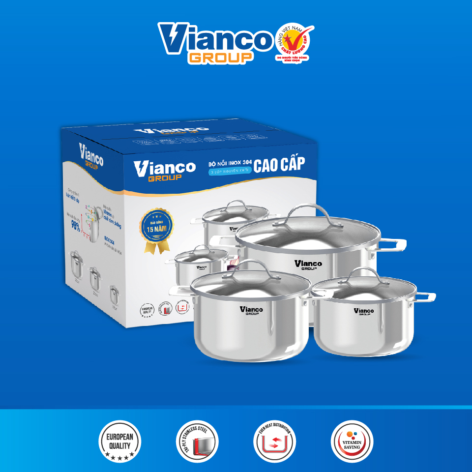 - Được sản xuất theo dây chuyền công nghệ chuẩn Châu Âu, bộ nồi Vianco có khả năng giữ nhiệt tốt và phân bố nhiệt đều, giúp nấu ăn nhanh chóng và tiết kiệm năng lượng.