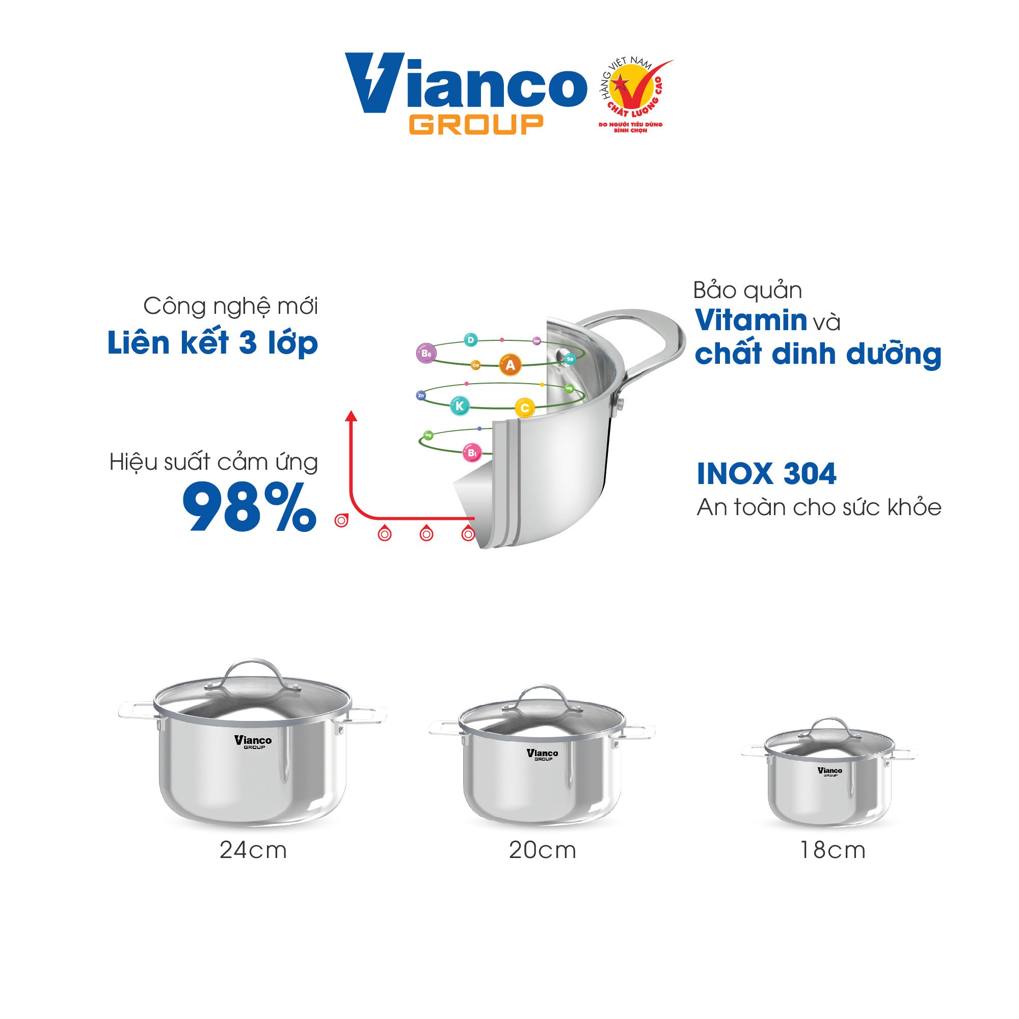 Bộ 03 nồi size ( 18cm-20cm-24cm) inox 03 Lớp liền khối Vianco