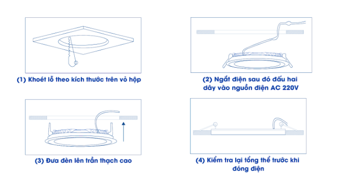 Bước 1: Sử dụng dụng cụ khoan phù hợp với trần nhà, khoan lỗ theo kích thước được nhà sản xuất ghi trên vỏ hộp, nên khoét lỗ vừa với đế đèn hoặc rộng hơn 1 chút để tiện cho việc lắp đặt.