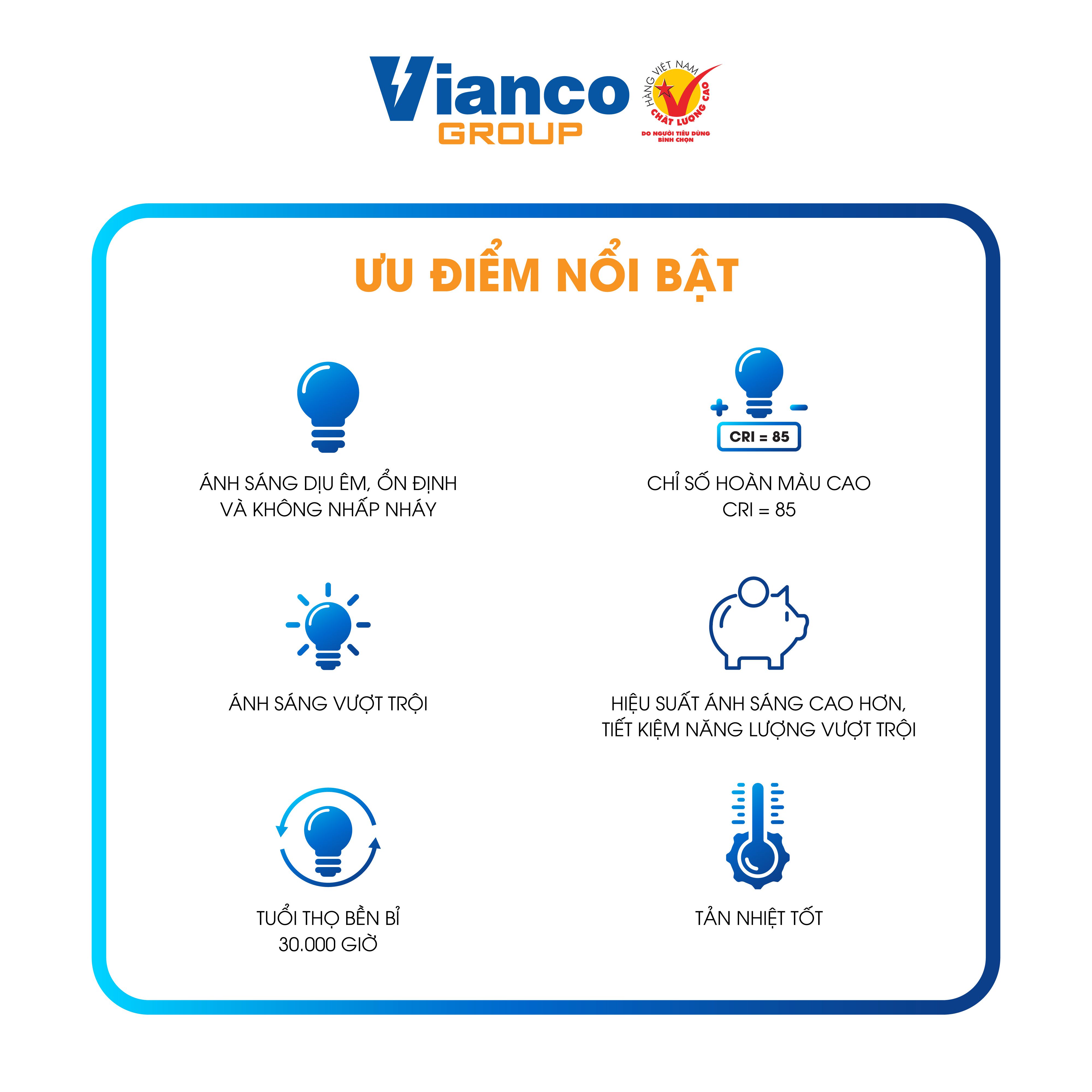 - Chỉ số hoàn màu cao (CRI ≥ 85): Tái hiện màu sắc trung thực, rõ nét, phù hợp cho nhiều không gian sinh hoạt và làm việc.