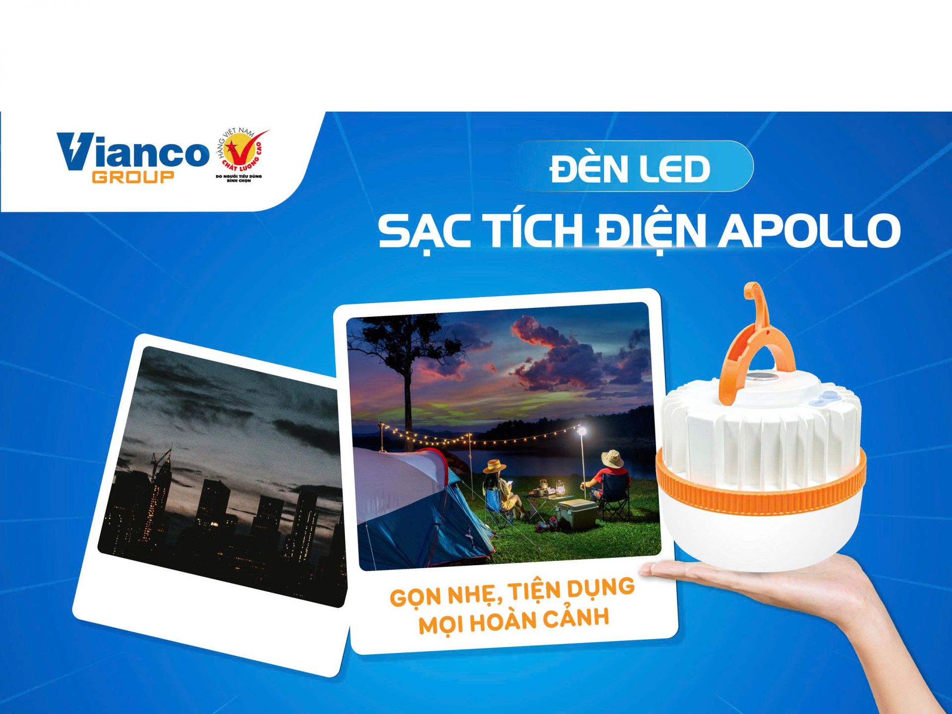Những chuyến cắm trại, dã ngoại hay các hoạt động ngoài trời khác sẽ trở nên thú vị hơn với đèn LED Apollo Vianco. Sản phẩm không chỉ cung cấp ánh sáng cần thiết mà còn tạo không gian ấm cúng cho những buổi tụ tập bạn bè, gia đình.