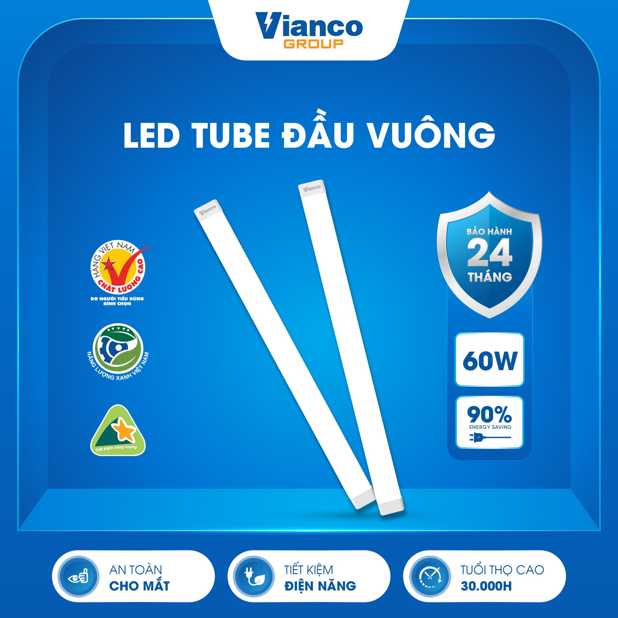 - Đèn tuýp LED đầu vuông Vianco sử dụng công nghệ LED hiện đại, tiết kiệm hơn 90% điện năng so với đèn huỳnh quang. Với công suất 40W nhưng cho độ sáng gấp 2 lần, giúp giảm chi phí đáng kể cho gia đình.