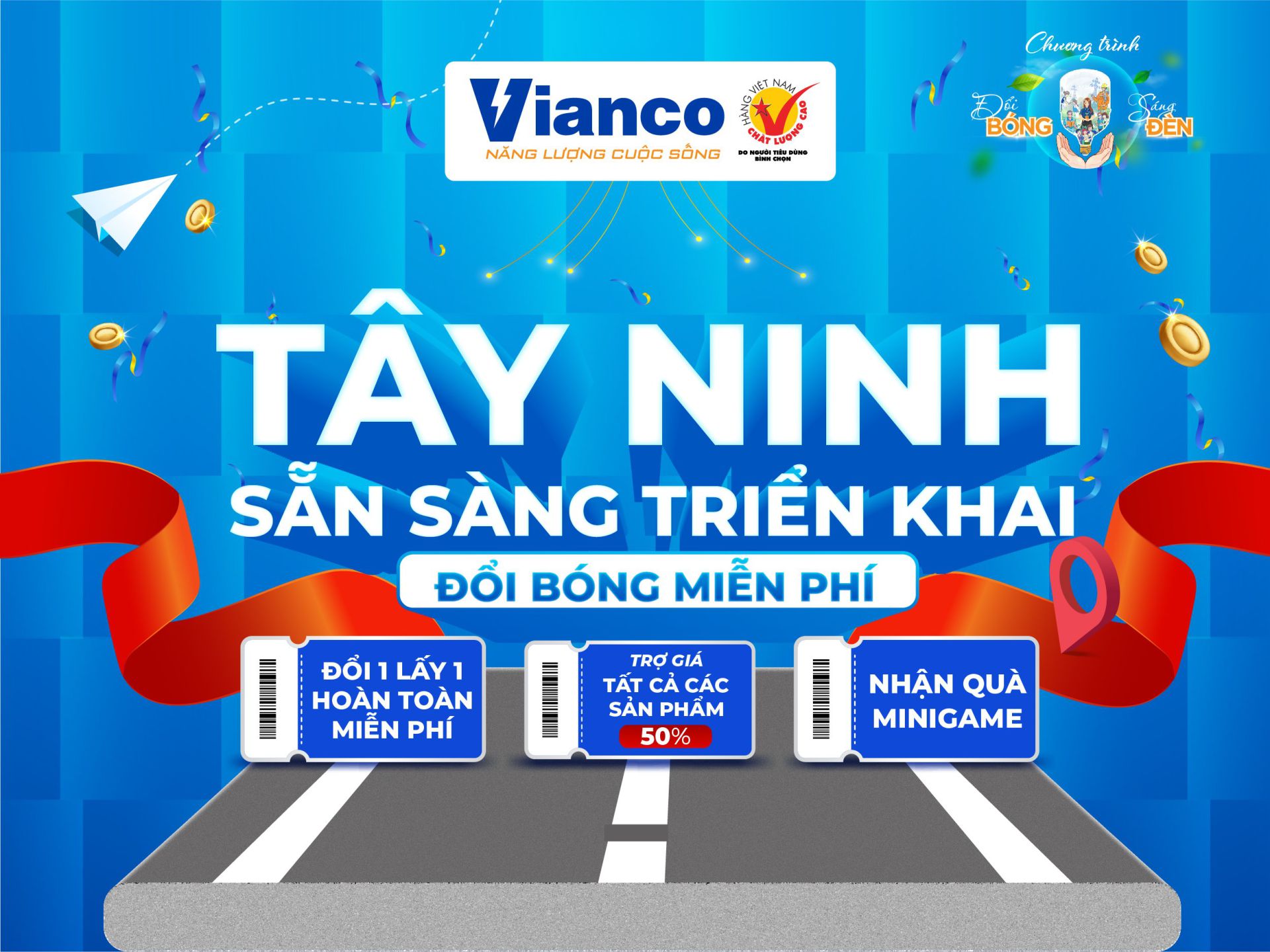 Chiến dịch đổi bóng miễn phí đã diễn ra thành công tại Thái Nguyên, Thái Bình, Hưng Yên, Quy Nhơn, Hà Nội, Tuyên Quang, An Giang, Bến Tre. Tập đoàn Vianco tiếp tục hành trình triển khai chiến dịch “Đổi bóng - Sáng đèn” tại các điểm đổi bóng khác trên 63 tỉnh thành toàn quốc. Và điểm dừng chân tiếp theo mà VIANCO lựa chọn chính là tại Thị Xã Hòa Thành - Tỉnh Tây Ninh.
