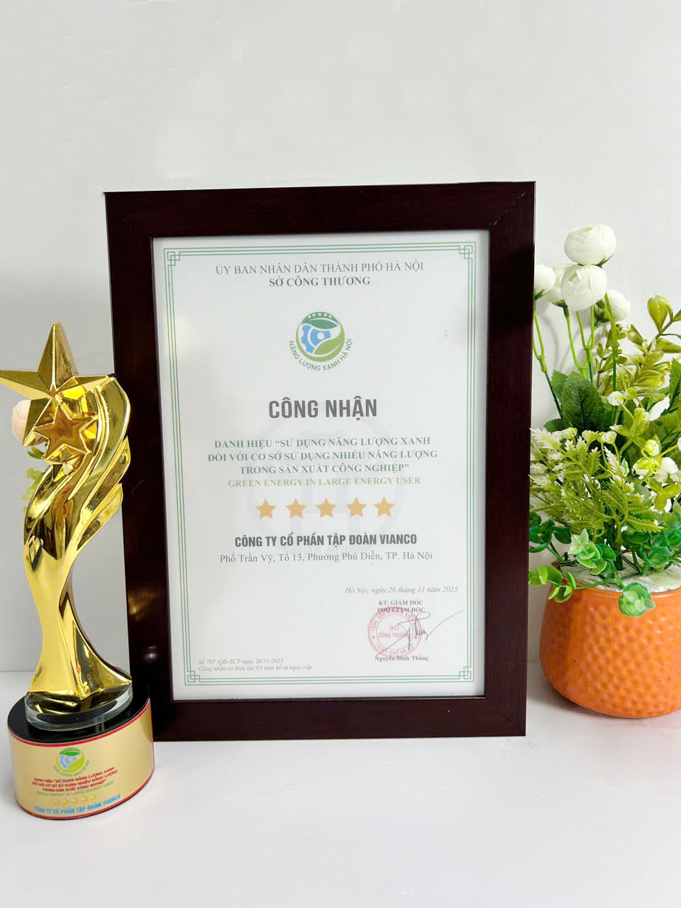 Ngày 10/12/2025, tại Trung tâm Hội nghị Quốc tế – Ba Đình, Hà Nội, Tập đoàn Vianco đã vinh dự được trao tặng danh hiệu “Cơ sở, công trình xây dựng sử dụng năng lượng xanh thành phố Hà Nội 2025”. Đây là giải thưởng uy tín, ghi nhận nỗ lực của các doanh nghiệp đi đầu trong tiết kiệm năng lượng và xây dựng mô hình vận hành thân thiện môi trường. Đối với Vianco, danh hiệu này là minh chứng cho hành trình bền bỉ theo đuổi mô hình sản xuất xanh xuyên suốt nhiều năm qua.